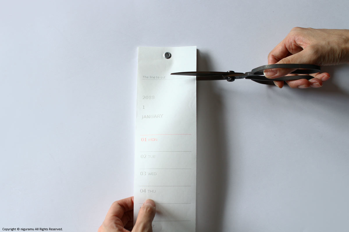 レジスターで印刷されたドット文字と細長が特徴のカレンダー。1ヶ月ごとにカットして使用します。1ヶ月の連続したスケジュールを縦に記載できるので、重複した予定も見やすく便利です。