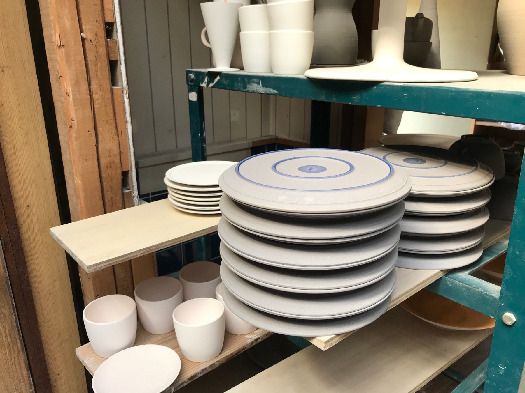 中に入ると以前の訪問時にはお会いできなかった黒泥シリーズを作っているD氏がろくろを回し中で、申しわけなくも手を止めていただき挨拶を交わした。その後、奥に進むと白皿を作っているN氏にニッコリと出迎えていただいた。