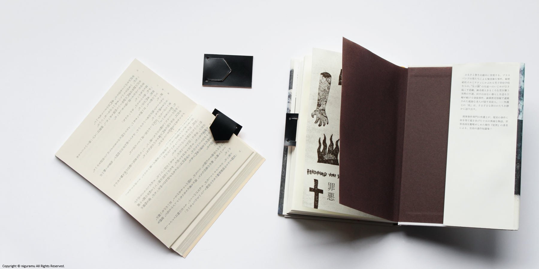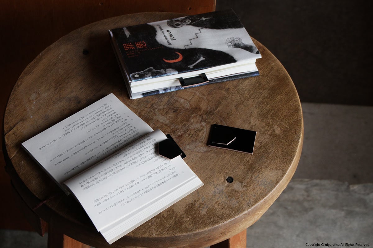 ページにしおりの下向き矢印の様なベロを差し込むと、読みかけの行を指した状態で本を閉じることができます。